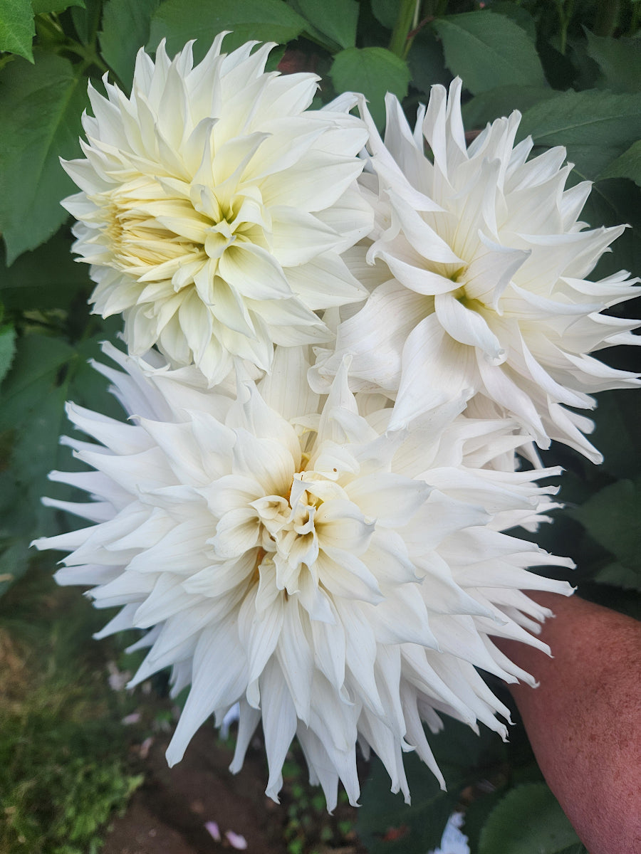 AC Yeti is full of showiness. Semi-Cactus with 7 to 8 inch blooms. It's snow white stunning flowers stand on a 4.5 ft plant. Good producer of strong stems that fill up a vase.